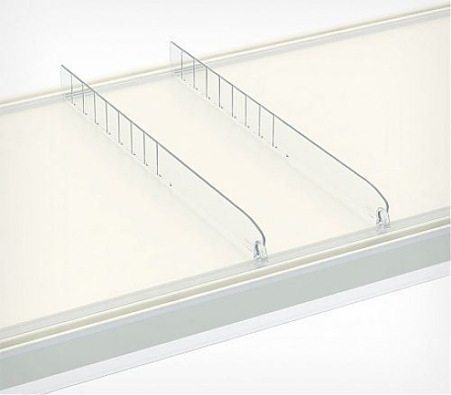 Разделитель DIV30-B выс.30 мм без огран.185-385 мм - предназначен для организации выкладки небольших лёгких товаров, таких как сигареты, лекарства, парфюмерия и косметика. материал: прозрачный ударопрочный пластик, имеет насечки с шагом 25 мм для обламывания по длине.