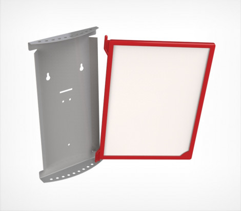Основание для настенной перекидной системы INFOLINE на 10 рамок INFOFRAME формата А-4. Настенный держатель изготовлен из металла, имеет два отверстия «замочная скважина» для крепления на стене. Используются усиленные пластиковые рамы, INFOFRAME.  Форма  держателя обеспечивает надежное крепление рамок.