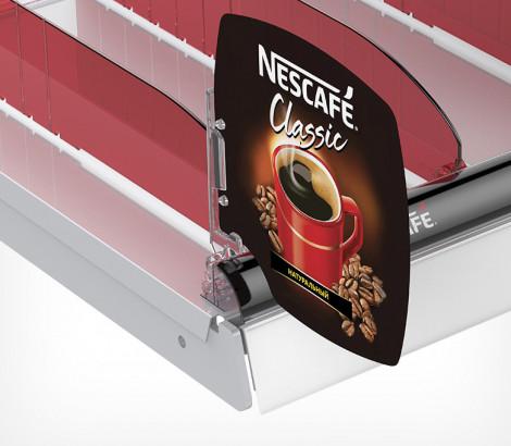 • Используется  передний профиль с ценникодержателем. Высота рекламной вставки - 30 мм. Имеет Т-профиль для крепления разделителей и толкателей. Крепится на полку на двухсторонний скотч.