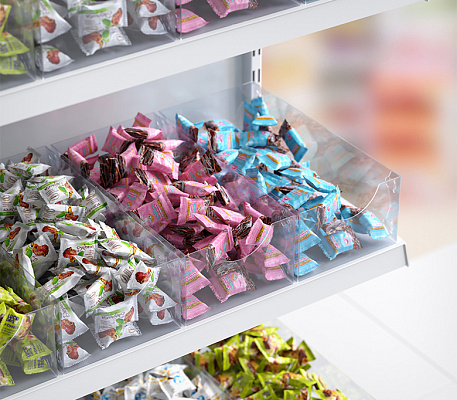 Складные пластиковые контейнеры для полок глубиной 400 и 500 мм предназначены для удобной выкладки мелких и сыпучих продуктов. Для широкого ассортимента товаров - конфет, орехов, сухофруктов, а также товаров для хобби и творчества.